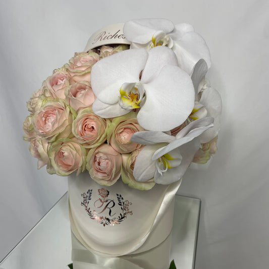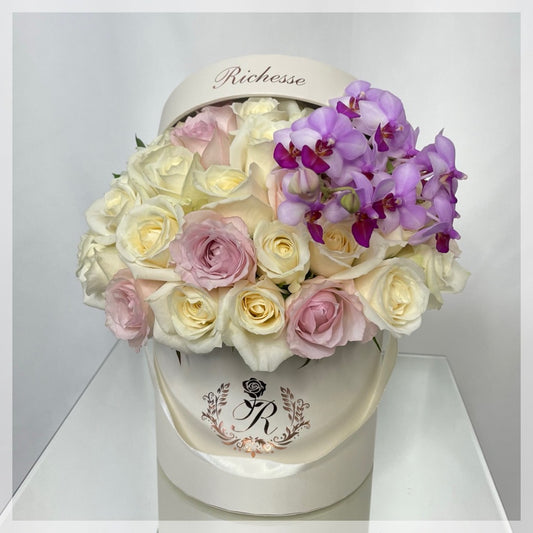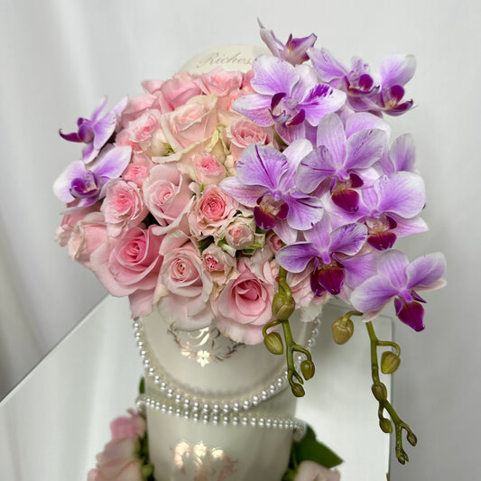 【Sサイズ】白バラとピンクバラとミニミニ胡蝶蘭アレンジメント