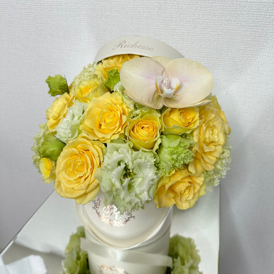 【Sサイズ】黄色バラと黄緑のトルコキキョウに胡蝶蘭一輪を添えたアレンジメント
